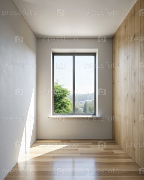 Яркая минималистическая комната с большим окном с живописным видом и естественным светом