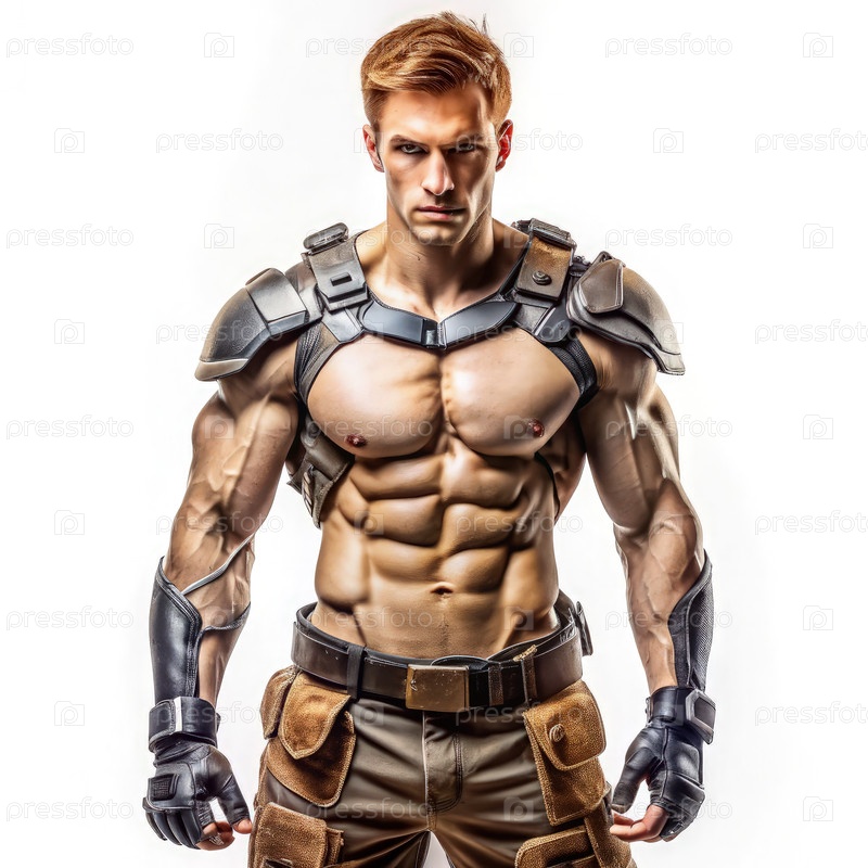 Молодой человек в тяжелом доспехе, демонстрирующий внушительные брюшные мышцы и мускулистость тела, уверенно позирует на белом фоне во время фотосессии с темой фитнеса