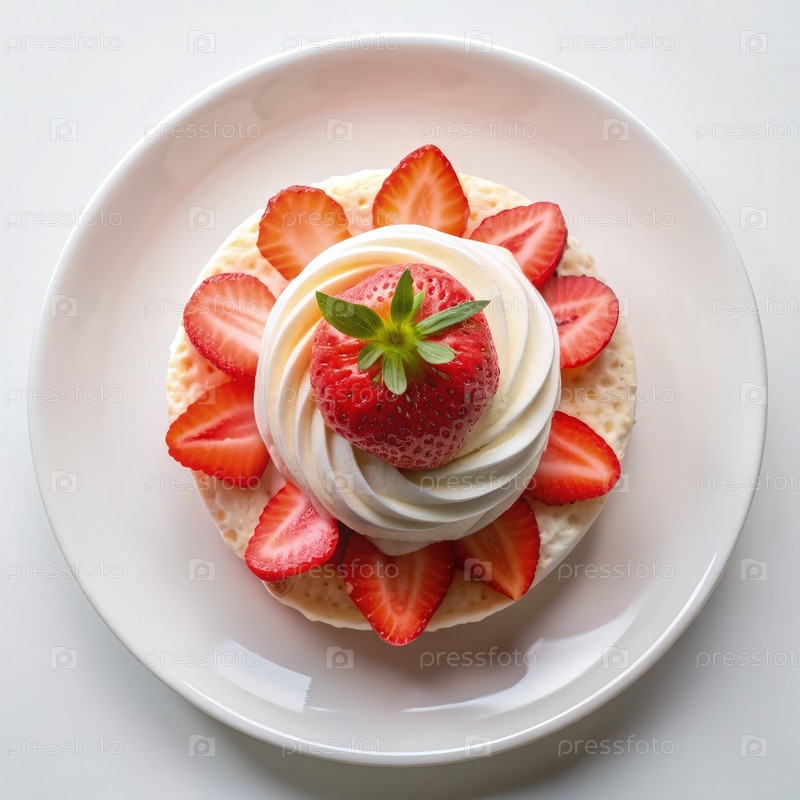 Вкусный десерт с пушистой сливочной начинкой, свежими клубниками и легкой основой, подаваемый на полноразмерной белой тарелке