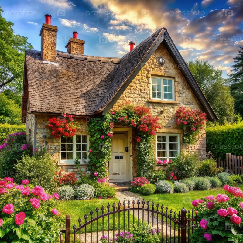 Очаровательный коттедж, окруженный яркими цветами и пышной зеленью под прекрасным небом в золотое время суток
