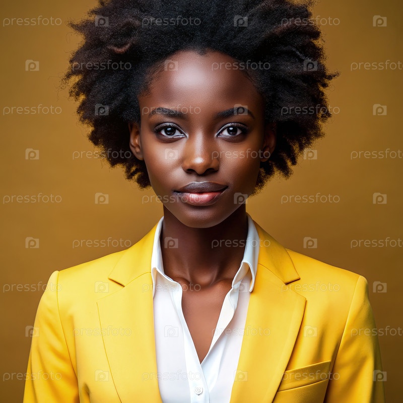 Молодая женщина в белом костюме уверенно позирует на ярком желтом фоне, демонстрируя свою красоту и уникальный стиль в художественном портрете