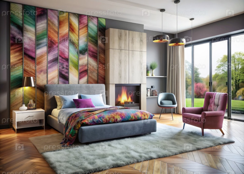Стильная интерьерная спальня с красочным декором и уютным настройкой кровати для камина