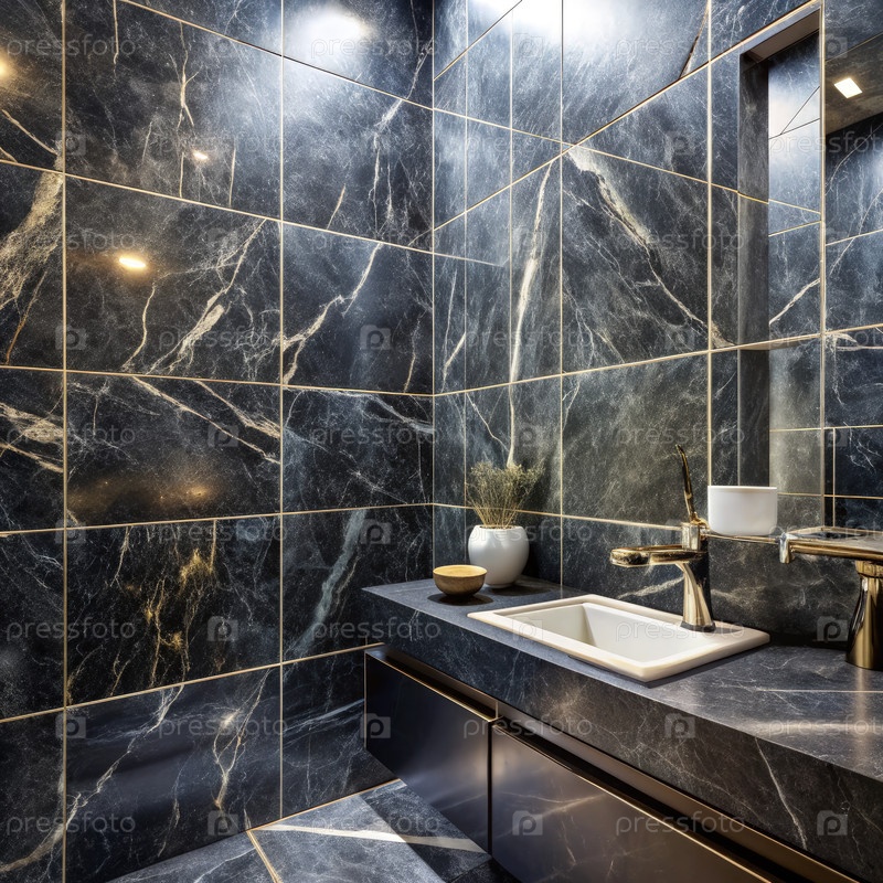 Элегантный интерьер ванной комнаты из черного мрамора с гладкой раковиной, тонким освещением и современными аксессуарами, предназначенными для роскошной атмосферы