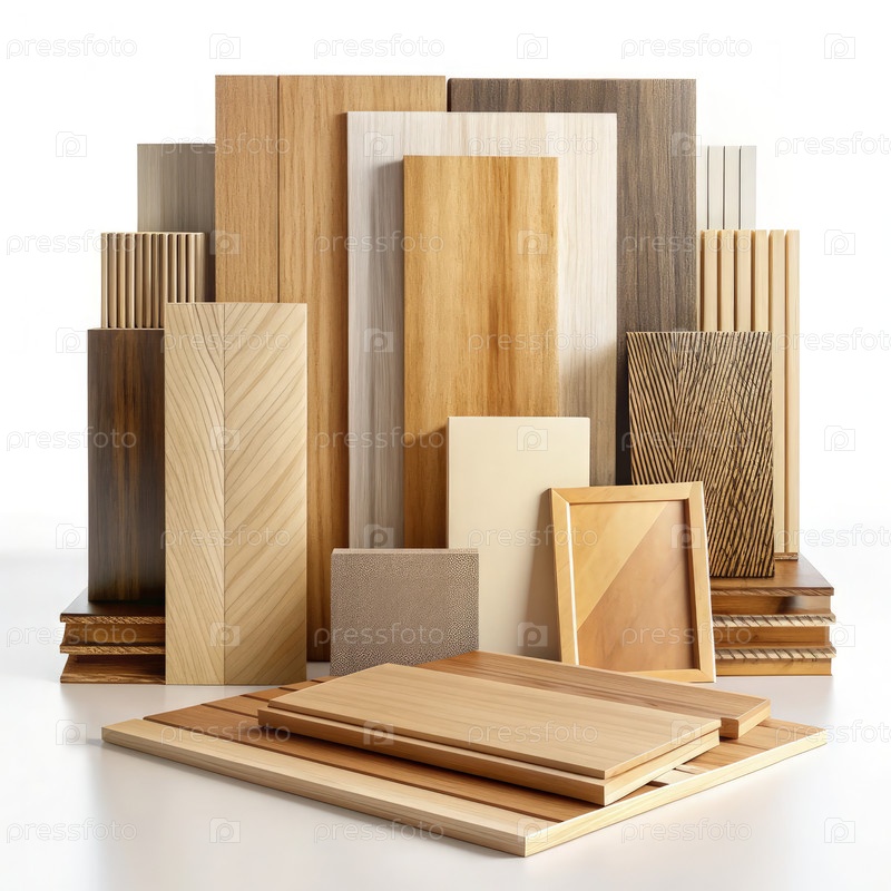 Различные образцы фанеры и фурнитуры из дерева отображаются на белом фоне