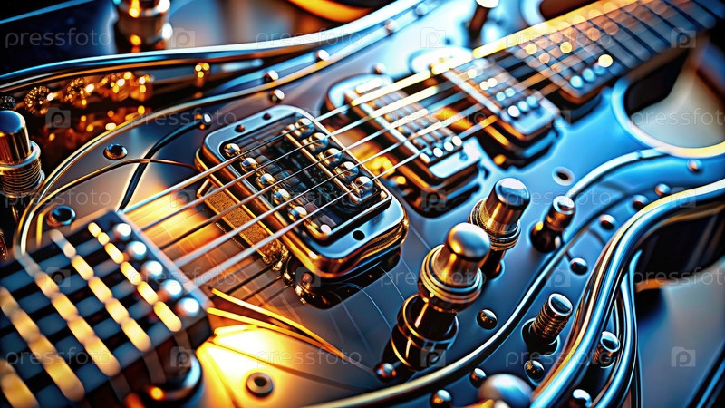 Потрясающий крупный план электрической гитары со сложными деталями и ярким освещением