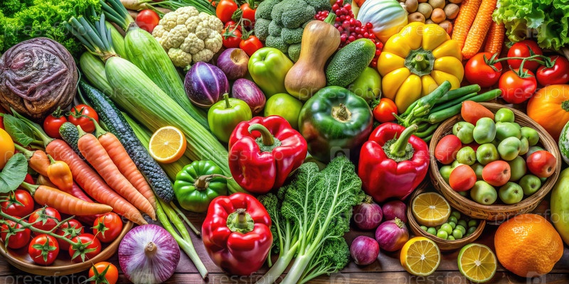 Вибрирующий ассортимент свежих фруктов и овощей отображается на деревянном столе