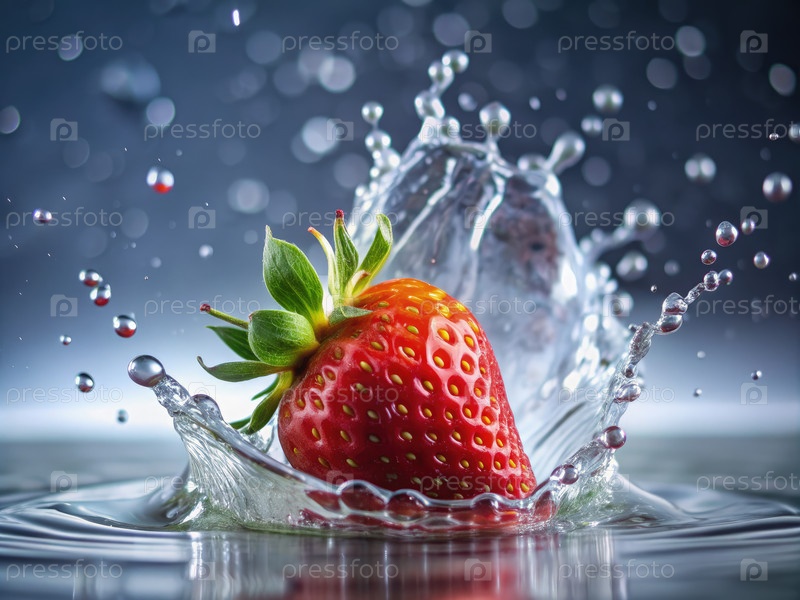 Вода брызгает вокруг спелой клубники на динамическом крупном плане