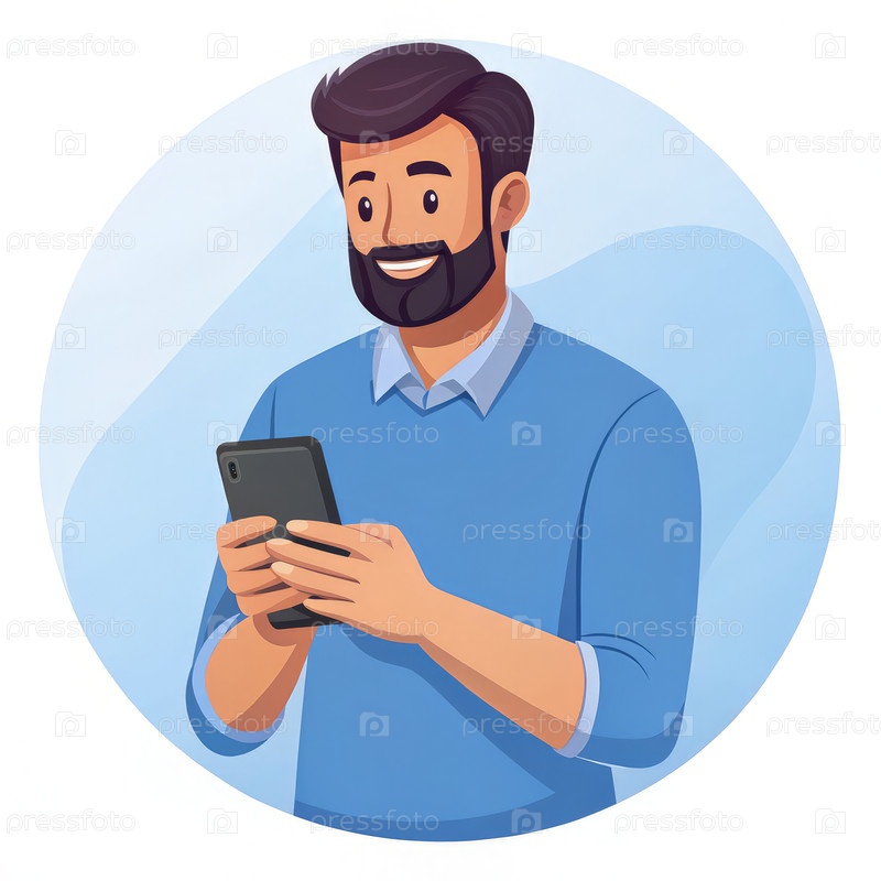 Мультфильм о человеке, использующем смартфон и улыбающемся в обычном синем свитере