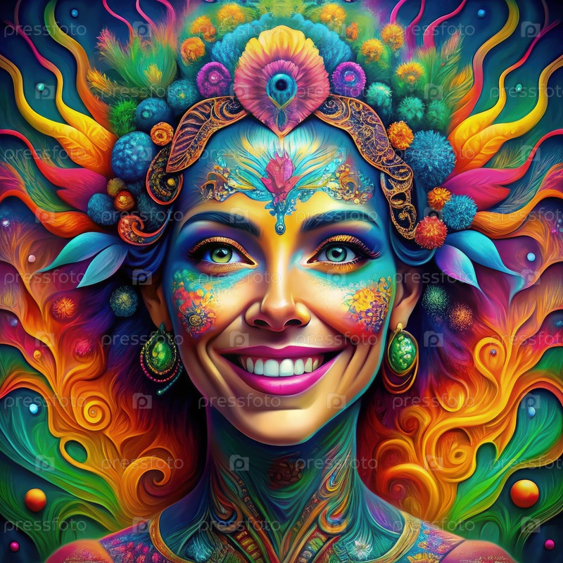 Психоделическая женщина с красочной краской на лице и ярким цветочным головным убором