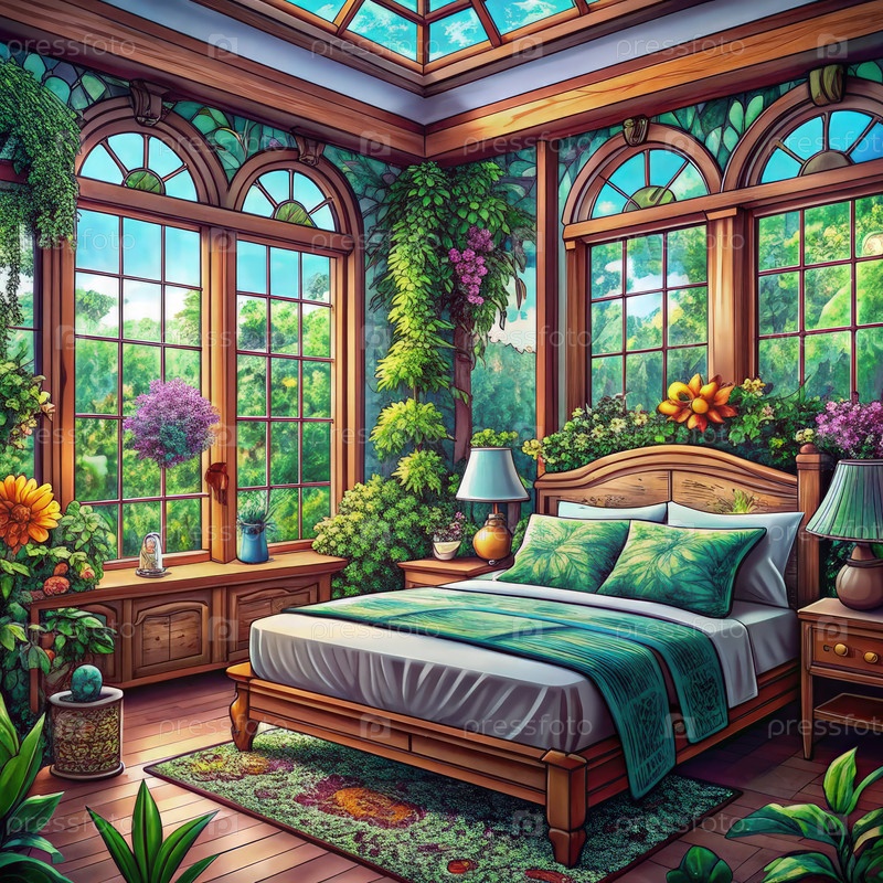 Уютная спальня в естественном стиле с большими окнами и яркой зеленью
