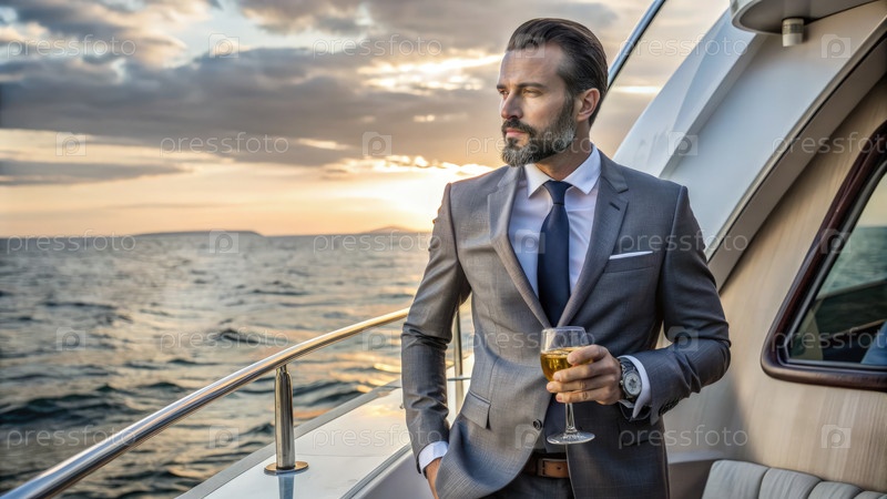 Джентльмен, наслаждающийся закатом солнца на роскошной яхте в костюме
