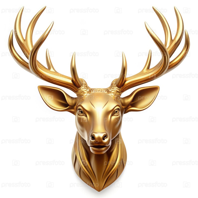 Утонченная и стилизованная голова золотого оленя на простом фоне, демонстрирующая сложные рога, идеально подходит для домашнего декора в элегантной обстановке