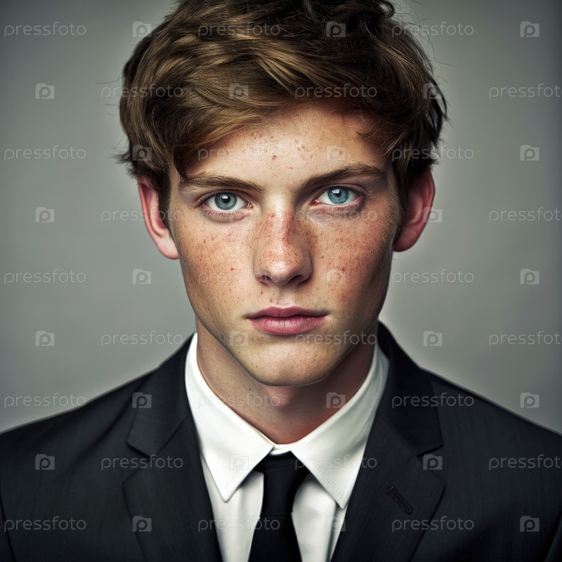 Молодой человек с коричневыми волосами и зелеными глазами, одетый в формальное платье