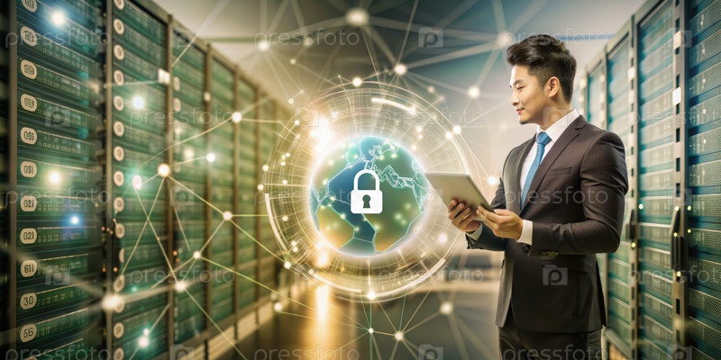 Бизнесмен использует передовые виртуальные технологии кибербезопасности в современном центре обработки данных, обеспечивая при этом глобальную защиту данных