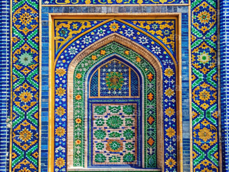 Красочная плитка исторического здания в Узбекистане, демонстрирующая сложные узоры