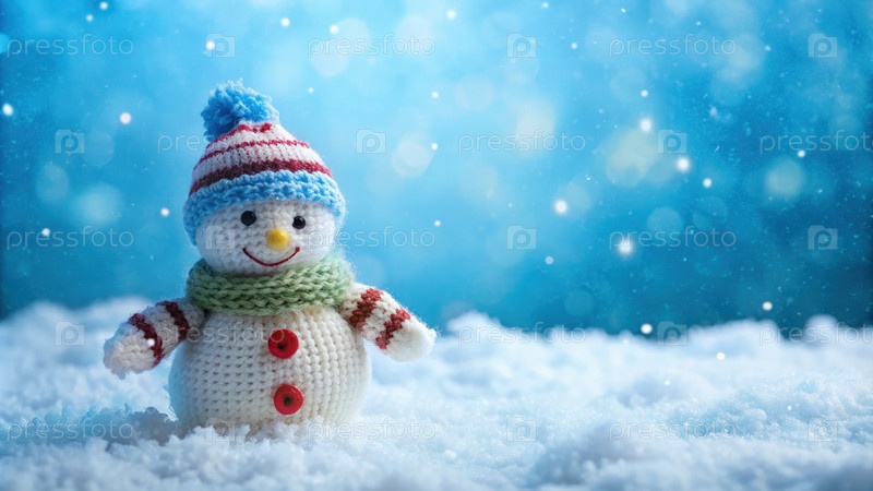 Трикотажный снеговик на мягком снегу с синим фоном и падающими снежинками