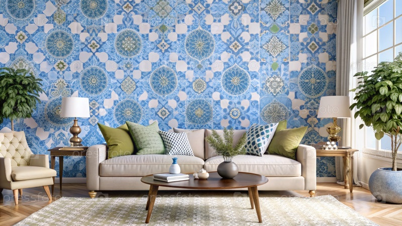 Элегантная гостиная с рисунковыми обоями и уютными мебелью в дневное время
