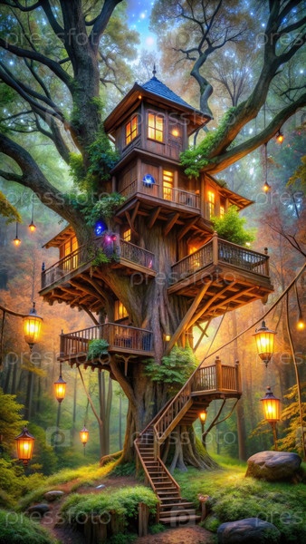 Потрясающе красивый дом на дереве, расположенный среди пышной лесной зеленых насаждений к закату