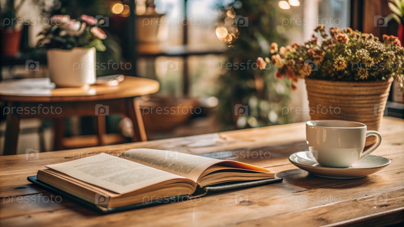 Книга самопомощи открылась на деревянном столе с чашкой чая и цветами