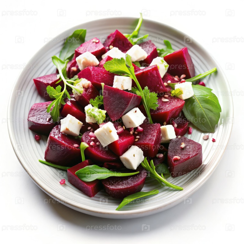 Свежий салат из свежей свеклы с яркими кубиками свеклы, кремовой фетой и зелеными травами на чистом белом фоне, идеально подходит для здорового приема пищи или гарнитура