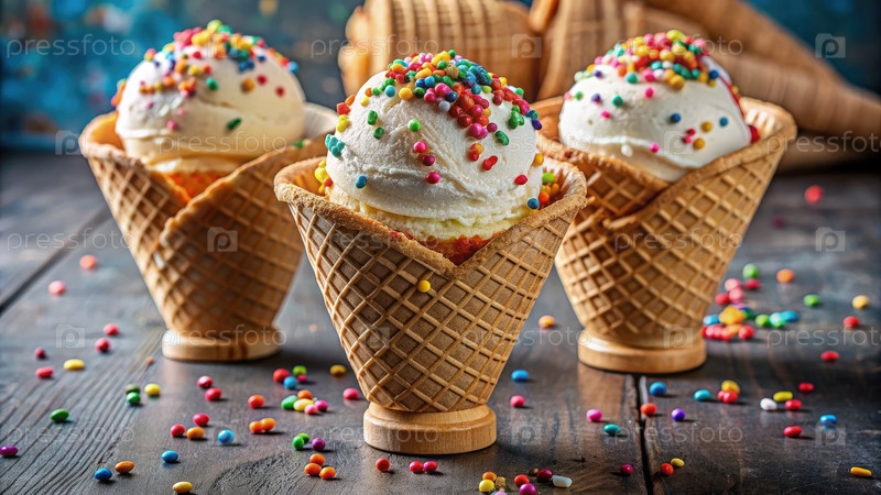 Праздничные конусы вафли, заполненные красочными порциями на вершине вкусных ложек мороженого!