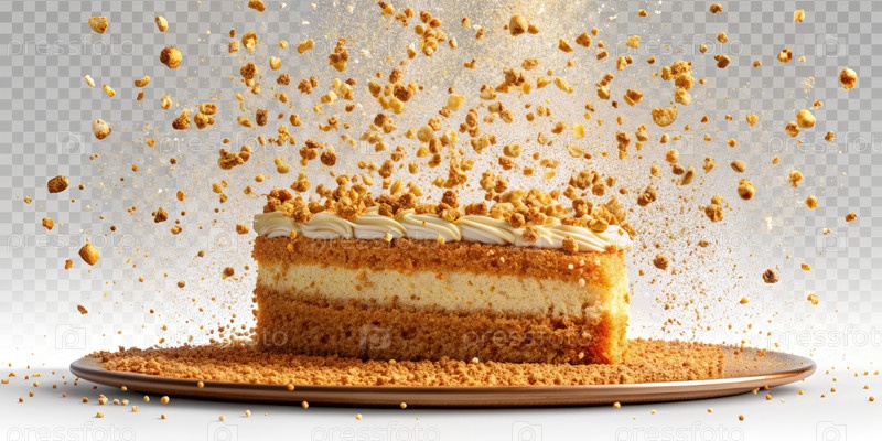 Вкусный торт с летающими крохими на прозрачном фоне, захватывающий радость выпечки во время праздничного торжества