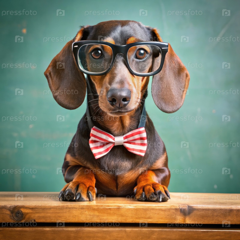 Стильный dachshund с очками и луками позирует весело на деревянной поверхности
