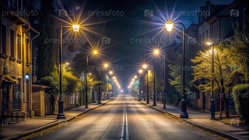 Тихая улица ночью, освещенная далекими источниками света и деревьями
