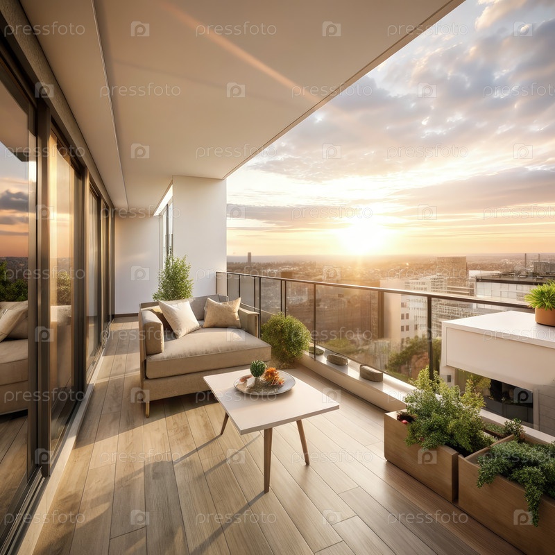 Вид на закат с современной террасы квартиры со стильной мебелью и зеленой средой в яркой городской обстановке