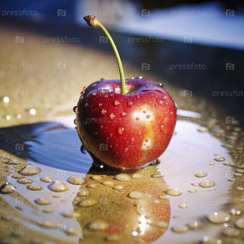 Свежее яблоко, сверкающее капельками воды в мягкой освещенной обстановке