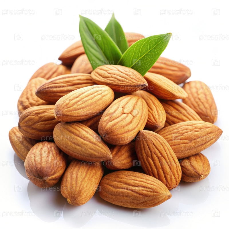 Свежие миндали, расположенные на белом фоне с зелеными листьями