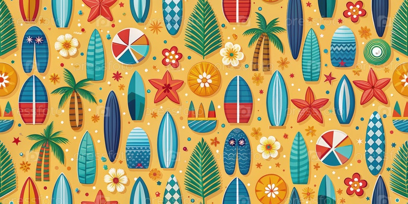 Цветные доски для серфинга и аксессуары пляжа с узором на солнечном фоне