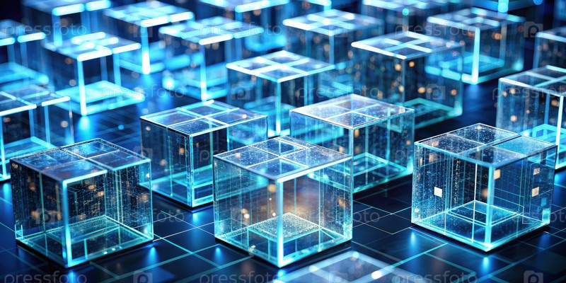 Увлекательное расположение взаимосвязанных прозрачных кубиков, демонстрирующих сложные детали с ослепительным световым дисплеем в современной обстановке