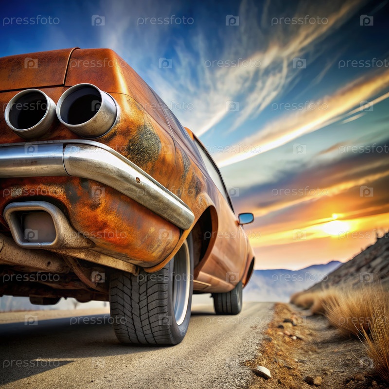 Ржавый оранжевый горячий род с хромированным выхлопом вверх по склону на закате солнца
