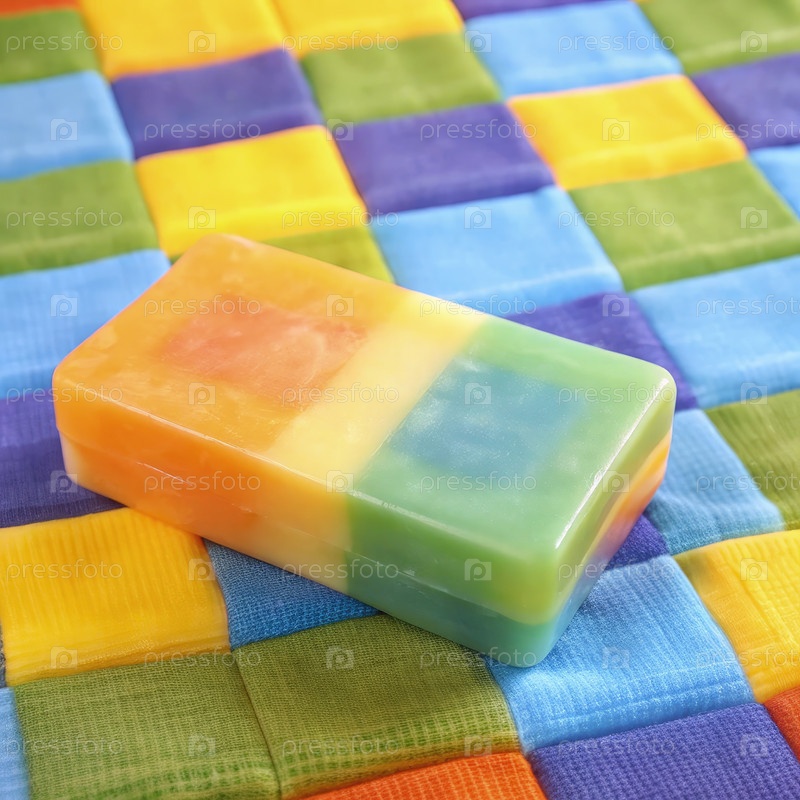 Яркое, многоцветное мыло для ванны, опирающееся на красочный тканый коврик в спокойной помещенной обстановке, приглашающее к релаксации во время купания