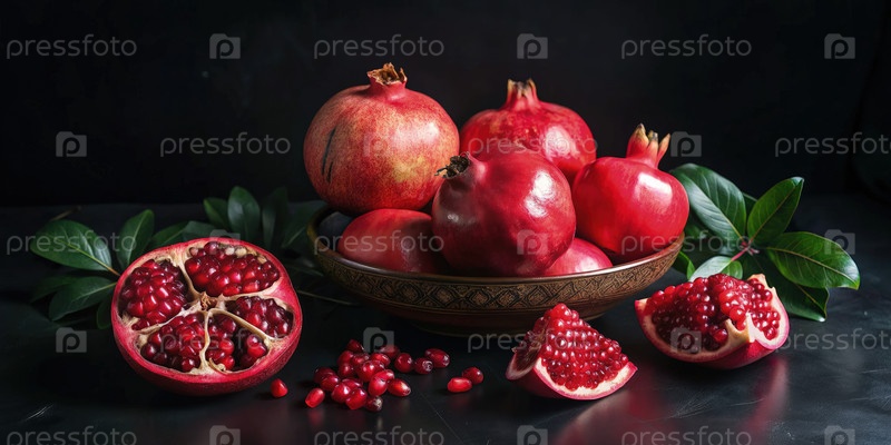 Свежие гранаты расположены на декоративной миске на темном фоне