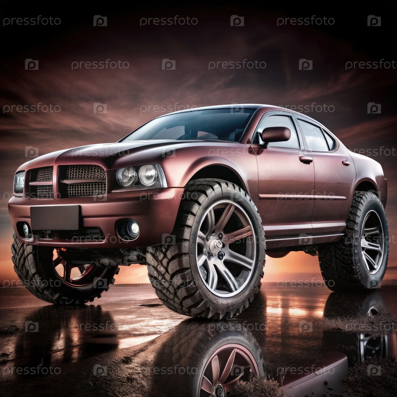 Специально построенный внедорожник с большими колесами на фоне драматического захода солнца