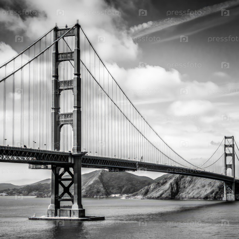 Знаменитый висячий мост простирается через залив, соединяя город с прибрежным пейзажем под облачным небом в спокойной черно-белой обстановке