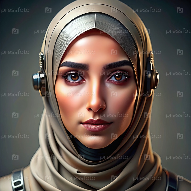 Роботизированный ИИ с черными волосами, носящий хиджаб в современной студии