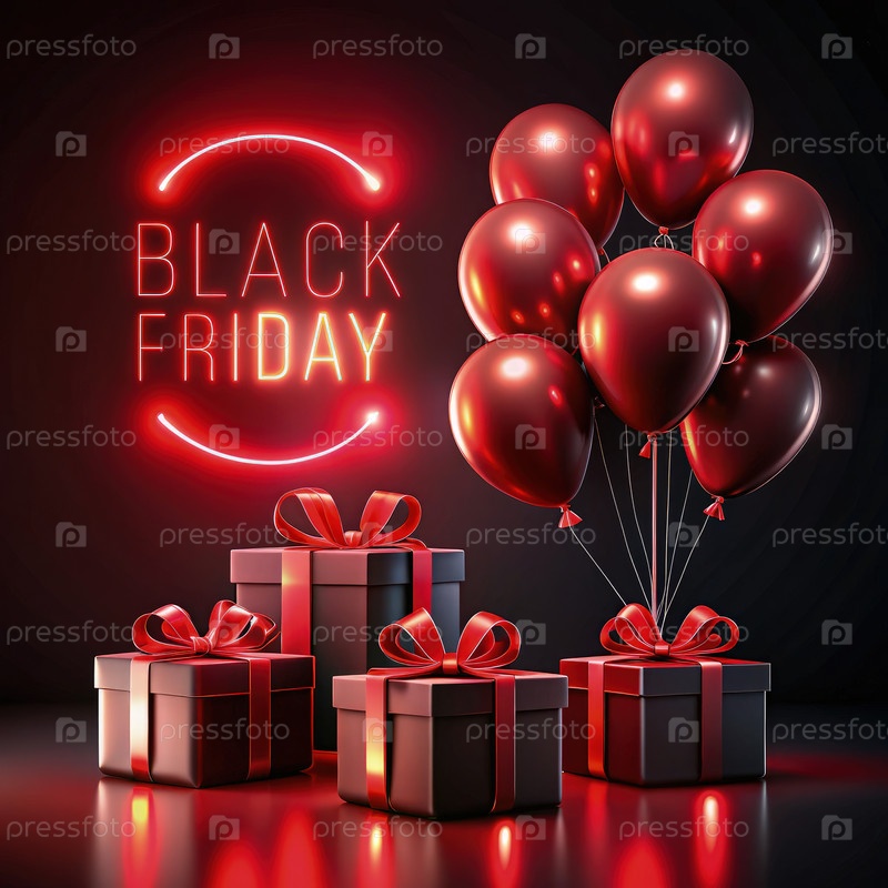 Отпразднуйте волнение Черной пятницы ярким рекламным плакатом с реалистичными коробками для подарков и воздушными шарами