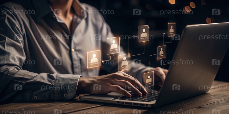 Человек, использующий ноутбук для управления документами в современном рабочем пространстве ночью