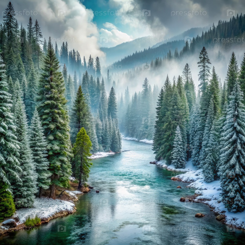 Пейзаж туманного снежного леса с рекой в США зимой