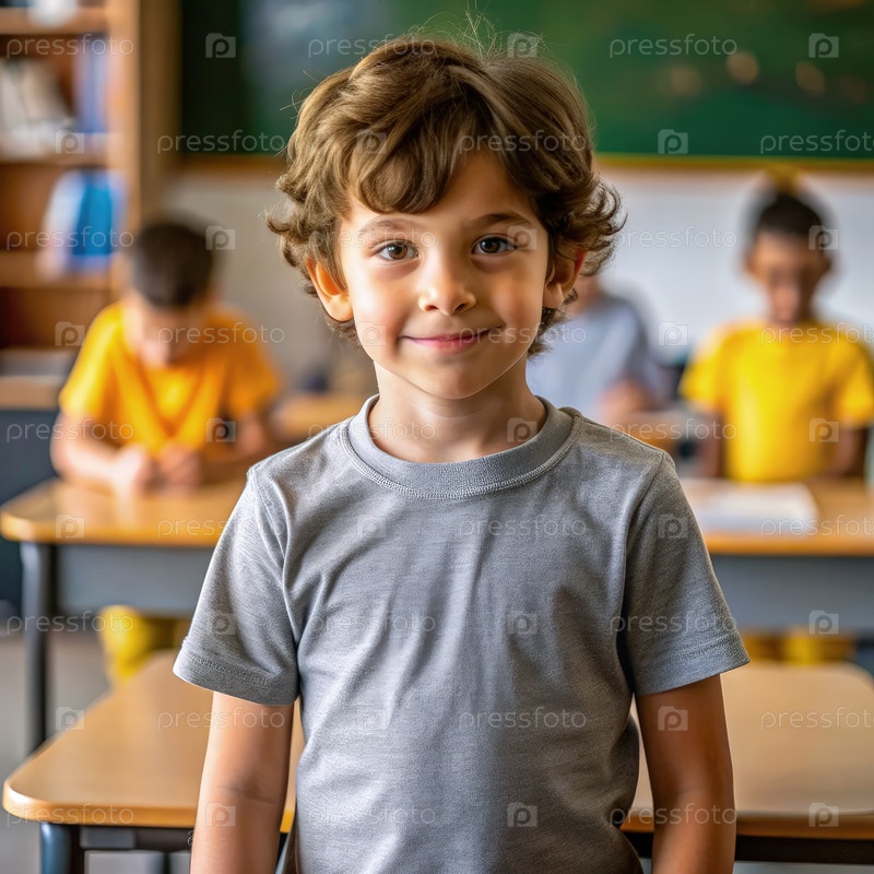 Молодой ученик улыбается, стоя в классе во время школьного времени
