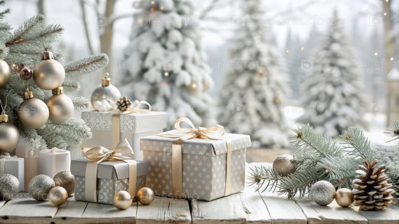 Красиво упакованные коробки для рождественских подарков, окруженные праздничными украшениями и морозными деревьями в открытом зимнем ландшафте