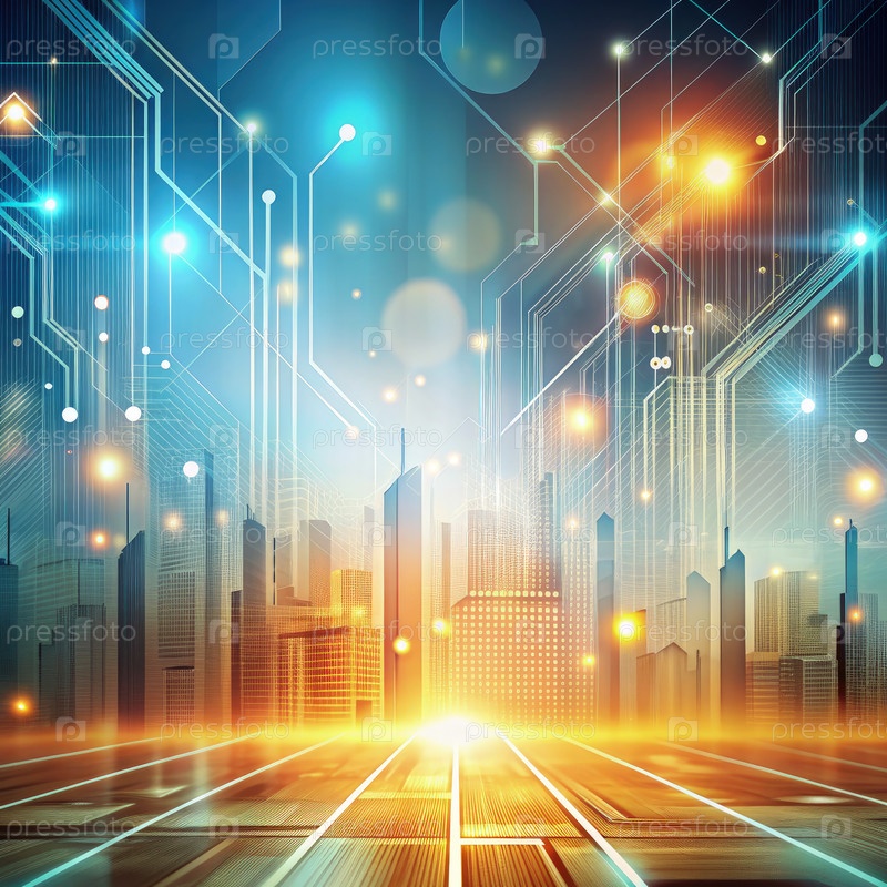 Горизонт современных технологий с футуристическими элементами на закате