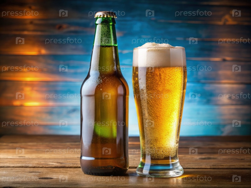 Освежающее пиво подается в стакане рядом с бутылкой на деревянном столе