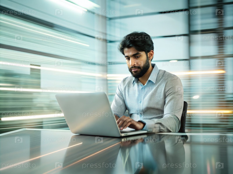 Индийский мужчина работает на ноутбуке в современном офисе днем