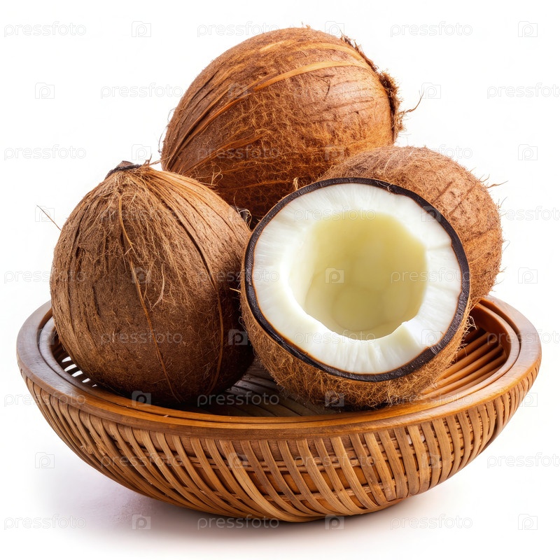 Зрелые свежие кокосы отображаются на деревянной корзине с белой шкалой