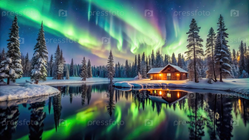 Потрясающее северное сияние освещает тихую хижину в снежном лесу