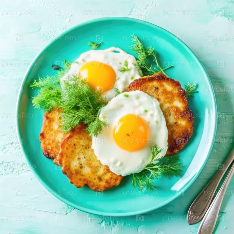 Вкусные Драники со жареным яйцом, подаваемые на ярко-синей тарелке для завтрака
